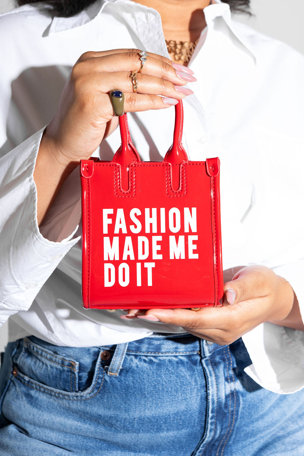 Our signature handbags complete looks and start conversations! Our bold Fashion Made Me Do It logo proclaims to the world that you are a certified retail therapy expert!